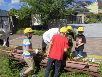 正門を入った右側にあるプランターの草引きをしました。