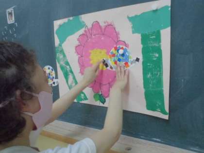 アジサイとカタツムリを描きました。花びらは,スタンプに色をつけ,ポンポン押して描きました。葉は,1・2年生が使い始めた絵具と筆で描きました。その絵の中にカタツムリを紙工作と貼り絵で2匹作り,その2匹のカタツムリが,楽しい会話をしていると想像し,ミニストーリーを考えて発表しました。