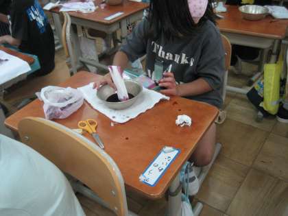 その色水で和紙を染めました。とてもいい感じに染まり,みんな大満足です。