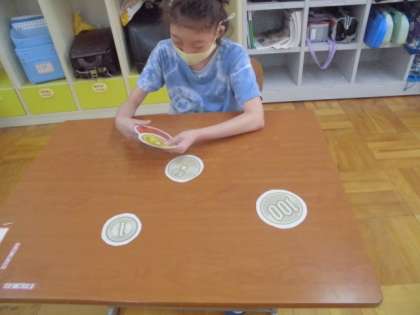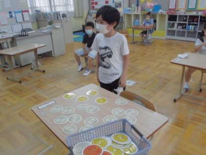 今日は,みんなで硬貨の種類を学習し,模型の野菜に値段をつけて,学習用硬貨を使い,お釣りがでない野菜を買う学習をしました。