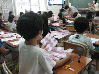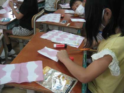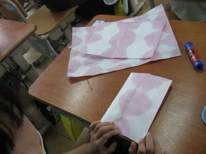 朝顔の色水で染めた和紙で,今日は封筒を作りました。