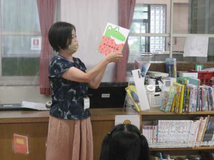 2学期最初の図書の時間です。司書の先生に,「すかのたね」の本を読んでもらいました。その後,本を借りました。