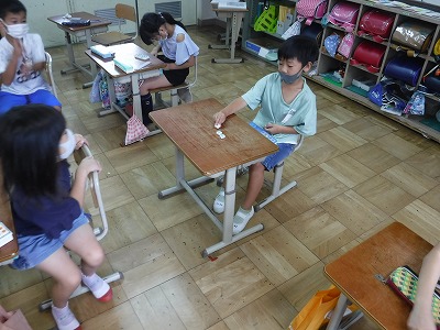 活動では,1学期の復習もかねて,「いくつかなクイズ」をしました。数図ブロックを使い,「How many blocks?」と問題を出し,「○ blocks」といった英語でのやり取りをして実践しました。