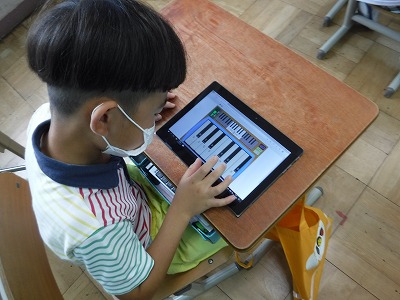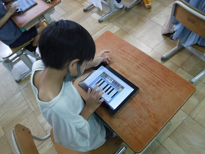 けんばんハーモニカがふけず,音楽の時間には指の練習だけで音色が聞こえない・・・という状況でしたが,GIGA端末をつかうことで音色を確かめながら練習できるようになりました。今日は自分の端末にインストールし,操作法を確かめました。