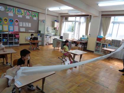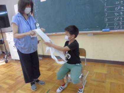 トイレットペーパーの使い方を練習しました。トイレットペーパーをとりすぎたり,ぐるぐると丸めてだんご状態で使っていたりする子ども達がいました。そこで,トイレットペーパーのとる量と,たたみ方や使い方の練習をしました。