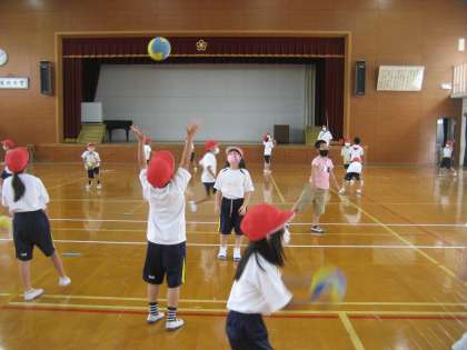 今日は,1人でボールを上に投げて,両手で受け取る練習をしました。