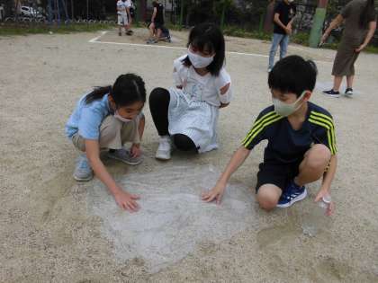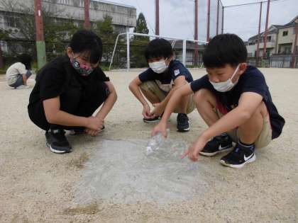 水たまりがどこに消えてしまったのか…子どもたちから出てきた予想の2つ目『水は流れていくのか?』について調べました。運動場にビニールをしいて,水をそっと流しました。すると水が…「低いほうに流れているんじゃない?」「反対には流れないね」と気づいたことを口々に言いながら何度も試していました。