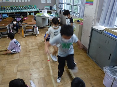 今日は雨のため,楽しみにしていた体育ができませんでした。が,音楽でチャレンジしていたバンブーダンスで少しだけ体を動かしました。2回目ということもあり,リズムに合わせてステップを踏み,竹を動かしてもできる子が!できるようになった子は,友達にアドバイスするなど素敵な姿も見られました。