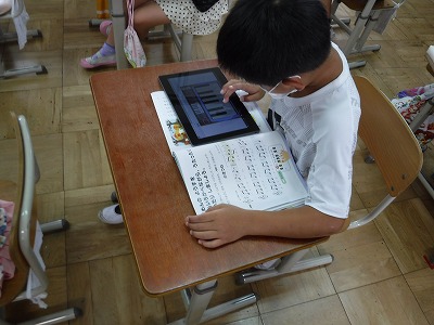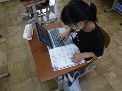 音楽の時間にけんばんハーモニカの練習をしました。GIGA端末を使い,音色を確かめながら練習できるので,子どもたちの意欲もこれまでとは違います。今日はパネルをタッチするのに加え,キーボードを使って練習する方法も試してみました。キーボードだと,実際に鍵盤を押さえる感覚に近づくのでとてもよい練習となります。