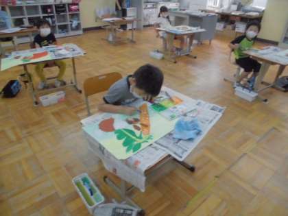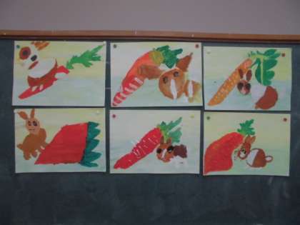うさぎのチャロとにんじんの水彩画が,描けました。「対象を注意深く観察し,一つひとつ丁寧に作業を進めることができるようになる。」を目標に頑張りました。実際にチャロに触れたり,iPadで撮影したチャロの画像や動画を見て意見を交換したりしました。着色は,絵具のチューブを2つ両手に持って,にんじんの色が,「赤なのか,オレンジ色なのか」を実際に比較し,近い色を導き出すようにしました。目標に合った作品を描くことができました。