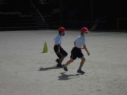 バトンの受け取りから,コーンの周り方,みんなで考えながらすすめてます。