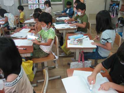 「うみのかくれんぼ」の学習で,読み取りながら「かくれんぼ図鑑」を作っています。