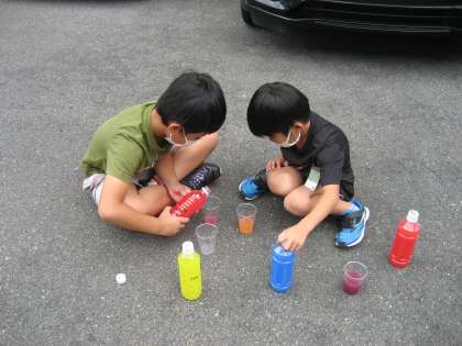 作った色水を持って,外に出ました。そのあと,色々な色水を混ぜて,どんな色水ができるのか,楽しみました。