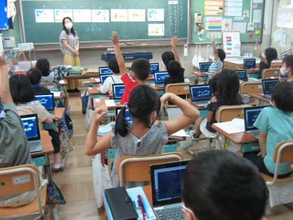 国語科の時間に「くじらぐも」の学習で,お話を思い出しながら,ロイロノートを使って挿絵を並び替えました。