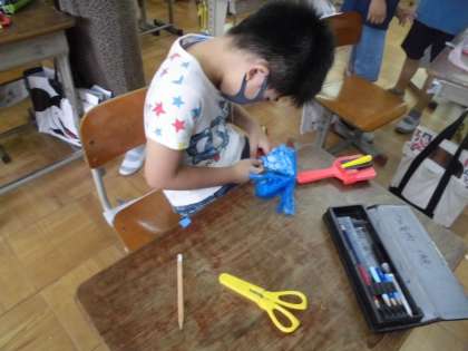 本番が近づいてきました。踊るときにつけるハチマキや鳴子のかざりを作りました。気持ちをこめて作っていました。