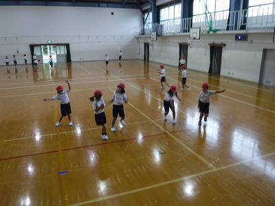 体育の学習で「リズムあそび」が始まりました。今日はとにかく曲に合わせてからだを動かそうと,様々な曲をかけてみました。これまでにみんなでおどったことがある曲では,動きを思い出しながら楽しく踊れますが,いざ新しい曲になると戸惑いの様子。しかし,これまでの動きを思い出し,ボックスステップやターンなど少しずつ動きが見られるようになりました。授業の後半には,アレンジを加えた動きも見られました。