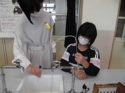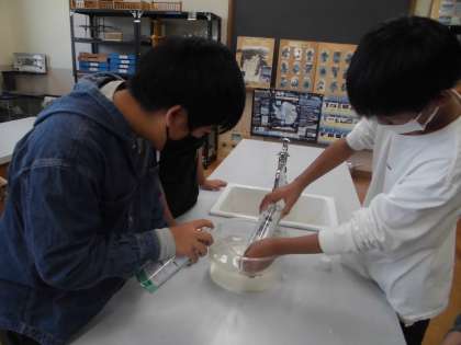 炭酸水を熱して水を蒸発させてもなにも残らない…一体何が溶けているのでしょう。炭酸水を振ったり,お湯につけたりしながら炭酸水について調べました。炭酸水のあわを集めて石灰水に通すと…白くにごりました。ということは,炭酸水にとけていたものは!?