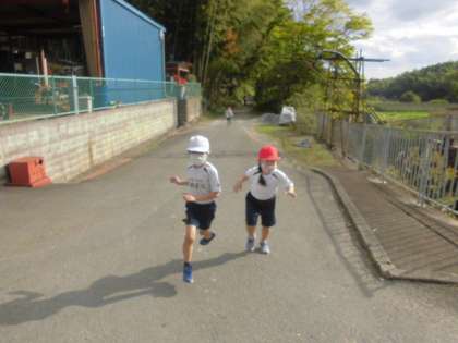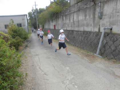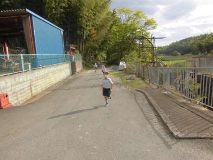 11月16日(火)が,持久走大会です。1・2年生は,約1200m 3・4年生は,約2400m 5・6年生は,約3000mを走ります。今日は,暖かい日差しの中,きれいな竹林に挟まれた3・4年生のコースを歩いたり,走ったりしました。