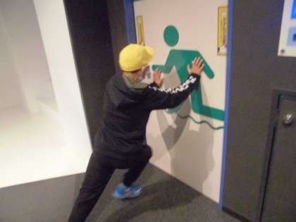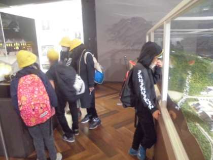バスに乗って,京都市市民防災センターに行きました。大水で扉が開けられなくなること,地震で家の中が,大きく揺れていろいろなものが倒れてくること,消火器を使って火を消すこと等の体験をすることができました。その後は,動物園でチンパンジーと疏水の見える場所でお弁当を食べてから,疏水に沿って歩きました。田辺朔郎博士の銅像を見て「トンネルを作った人や。」と話してくれました。