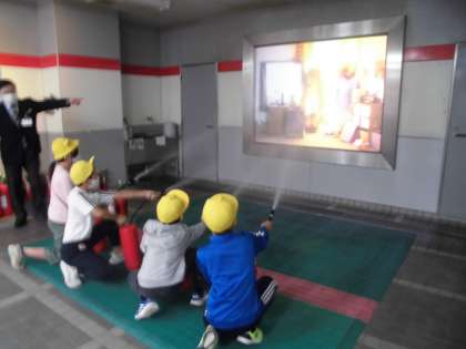 消火体験では,消火器の使い方を知り,実際にやってみました。ドキドキしながら,真剣に取り組んでいました。