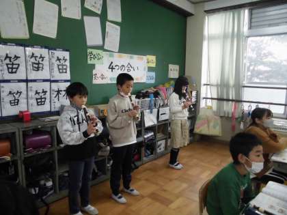 「オーラリー」という曲をリコーダーで練習してきました。今日は,2つのパートに分かれて班ごとに発表しました。どの班も今まで練習してきた成果を発揮し,素敵な二重奏を演奏していました。