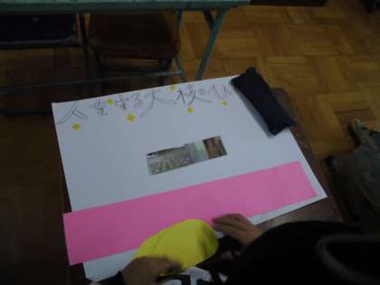 今までの学習を振り返り,学んだことや感じたことをポスターに書いています。