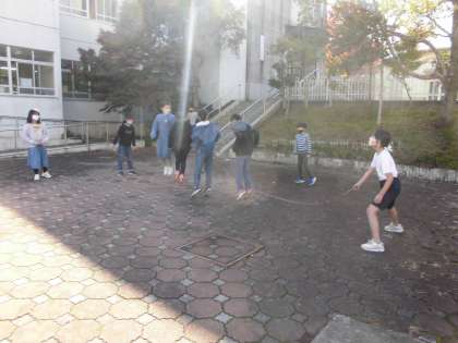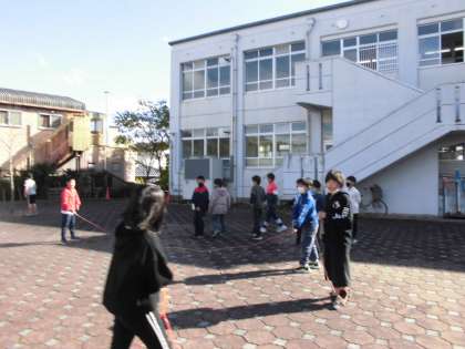 体育の授業で縄跳びに取り組んでいます。最近は,休み時間に縄跳びをしている子どもがたくさんいます。今日は大繩で遊んでいました。クラスもこえて,学年でみんな楽しそうに過ごしています。