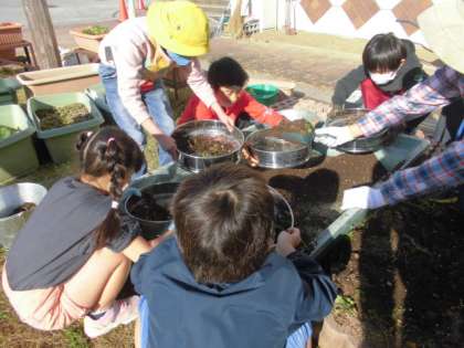 古くなった土をふるいにかけて,ふかふかに柔らかくなった土に肥料を混ぜました。好きな色の花(ノースポール・パンジー・ビオラ・テルスター)を2株ずつ植えました。正門の近くに置いてあるので,登下校のときに,花の成長を見ていけるといいです。