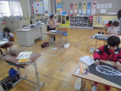 先日,収穫した大きなサツマイモの絵を描きました。今回は,黒い画用紙を使いました。サツマイモの皮の向きの流れを反対色の白い絵の具で,分かりやすく表現するように描きました。