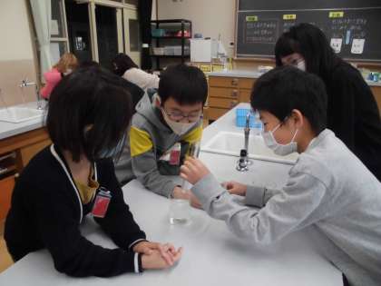 理科室での授業が始まりました。栓をしたペットボトルをお湯につけるとポンと音をたててとんでいきました。これは,空気はあたためられて体積が大きくなったからでしょうか?石けん膜をはった試験管をお湯であたためたり冷やしたりして,空気の体積の変化を確認しました。
