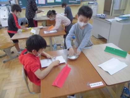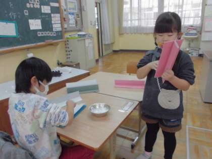 和紙を貼りつけた大根に白い色を塗りました。次に大根の葉にチャレンジです。色付き段ボールを折り曲げてボンドで張り合わせました。