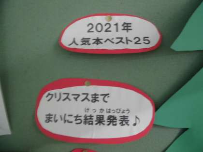 季節を感じさせられる掲示物に2021年の人気の本はなんでしょうか。わくわくする図書室前の様子です。