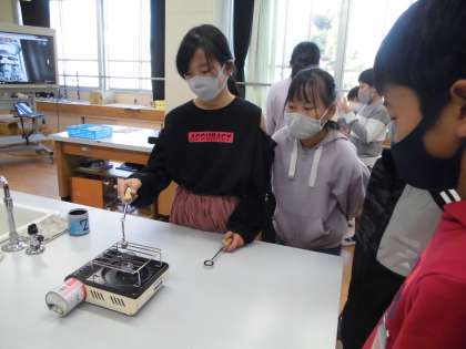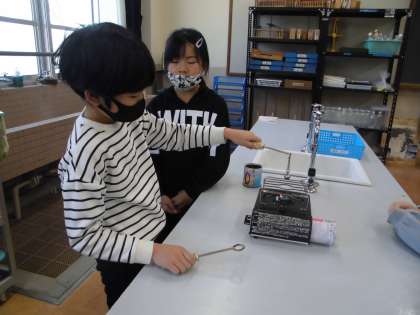 今日は,ガスコンロを使って,金属の体積の変化について調べました。初めて使う道具なので安全面での注意や使い方をしっかり確認してから実験を始めました。かたい金属もあたためると体積が大きくなることを知り,子どもたちも驚いた様子でした。