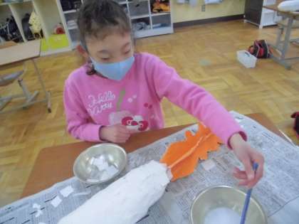 大根に大根葉を取り付けました。このままでは,ポキッと折れてしまいそうなので,和紙を貼って補強しました。次は,大根が地上に顔を出しているところに色を塗ります。この6本の大根をどのように展示しようかと思案中です。
