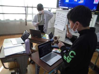 タブレット使ってグループごとにカードの組み合わせ方を考え,楽器を使って演奏する練習をしました。強弱を意識した響かせ方や,楽器の組み合わせ方など,それぞれ相談しながら音楽づくりをしていました。
