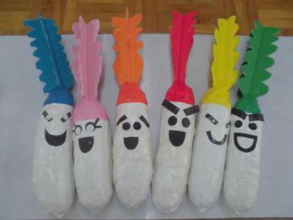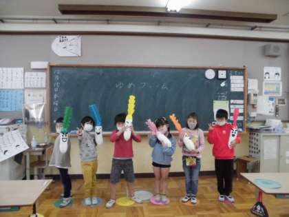 福笑いのように目や口を台紙に並べ,表情を比べてみました。その中から,一番のお気に入りを選んで,はりこの大根に目や口をはりつけました。作品を並べてみると,大根達が,まるでおしゃべりしているようでした。子ども達ひとり一人が,「ここを見てください。」というところを発表し合って作品を鑑賞しました。巨匠展では,紙で作った土の模型に大根をさして展示します。どんな作品になるか楽しみです。