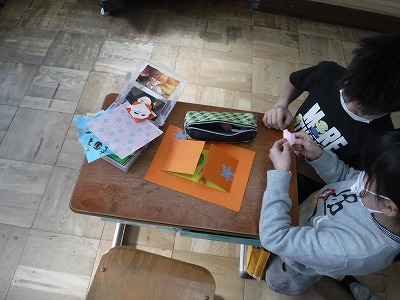 図画工作で「まどからこんにちは」に取り組んでいます。カッターナイフで窓を作り,その窓を生かしてクリスマスカードを作りました。渡したい相手をしっかりとイメージし,相手意識をもって作成しました。折り紙でサンタさんを折るなど,子どもたち同士でアイデアを出しながらとてもよいカードが出来上がりました。