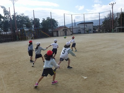 体育科でパスゲームに取り組んでいます。パスの出し方やもらい方など,どうすれば相手にとられすにゴールできるかを考えながら取り組んでいます。「そこにいたらもらえない」「横にパス!」など,ゲームに出ていない子からもよい声かけが聞こえてきます。