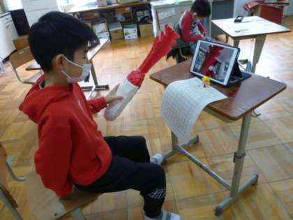 桂坂小学校とのZOOM交流会(1月26日)に向けて,作品(はりこの大根)を紹介する練習をしました。iPadの操作にも慣れ,大根の特徴に合わせてカメラに大根を近づけていました。テレビに映る友達の発表を励ましながら見守ることもできました。交流会が楽しみです。