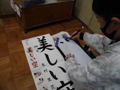書きぞめに取り組みました!字の大きさに気を付けて,画仙紙に「美しい空」と書きました。いつもとは違う画仙紙に書くので,ドキドキしながら集中して取り組んでいました。