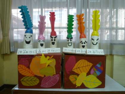 西京区の育成学級作品展のテーマが「夢ファーム」だったので,テーマのFarm(農場)から「楽しい大根ファミリー(Family)」としました。