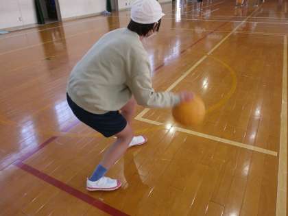 腰の辺りでボールをつく,進行方向を見ながらボールをつく,コーナーを狙ってシュートするなど,それぞれが友達にアドバイスをしあいながら学習を進めています。