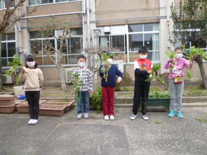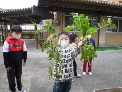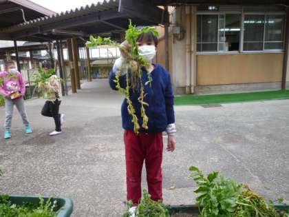 秋に植えた大根をぬきました。両手で葉をつかんで,「うんとこしょ どっこいしょ」と『(国語)大きなカブ』のようにぬきました。とれたのは『小さな大根』でしたが,みんな楽しそうに育てた大根をぬいて,根っこについた土を落としていました。