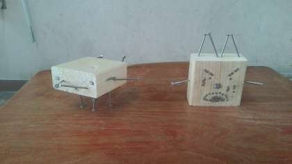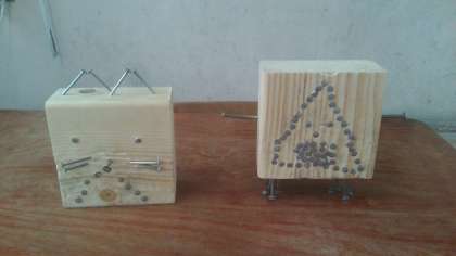 木切れに金づちでくぎを打って作りました。