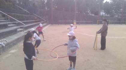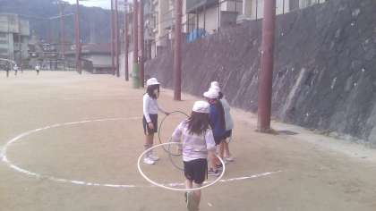 体育の「ようぐあそび」では,フラフープやぼうなどの用具を使って,色んな遊び方を試しました。