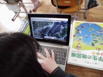 宮津市といえば,天橋立!今日は地図帳で位置を確認したあと,タブレットを使って天橋立の様子を見ました。