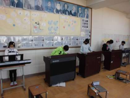 前学習で作った旋律を,オルガンや木琴・鉄琴などを使い演奏しました。リズムに苦労しながらでしたが,自分が作った旋律の音の響きを確かめていました。