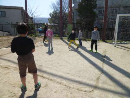暖かくなり始め,花壇の周りに生えている「ホトケノザ」や「オオイヌノフグリ」の野草の花が咲き始めました。プランターの掃除をしてから運動場で転がしドッジボールをしました。1年生と4年生が,二人でひとつのボールを投げていたので「友情ボールだね」と言うと,その後も友情ボールを投げていました。汗をかいて服を脱ぐ子もいて,もうすぐ本格的な春ですね。