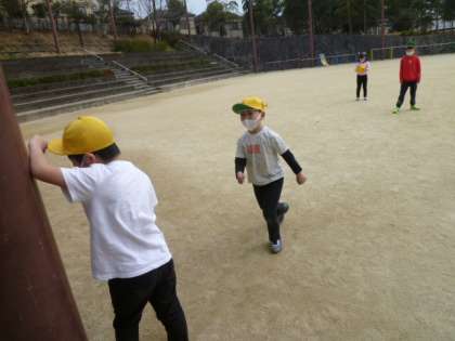 「ころんだの『だ』で振り返ること」や「押したりしないこと」「みんなで仲良くすること」等をルールにしました。オニになったり,逃げたりしながら,楽しい時間を過ごしました。