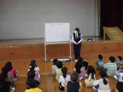 今日は地域の皆様,区役所の皆様,警察署の皆様にお世話になり,1年生の交通安全教室を行いました。横断歩道の渡り方や安全を確認することなど大切なことをいろいろと教わりました。内輪差の学習もじかに見せていただきました。ありがとうございました。